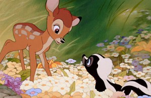 Bambi was released in the midst of World War II and thus did poorly at the box office in its initial theatrical run, though its subsequent re-release in 1947 recouped Disney’s losses from the film. The movie was nominated for three Academy Awards: Best Score, Best Sound, and Best Song for “Love is a Song” (though, to be perfectly honest, I don’t think this film is one of Disney’s better musical productions). It has since become one of Disney’s most beloved films; in fact, the American Film Institute chose Bambi as the third-greatest animated feature in film history, behind its predecessors Snow White and the Seven Dwarfs and Pinocchio.