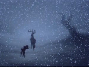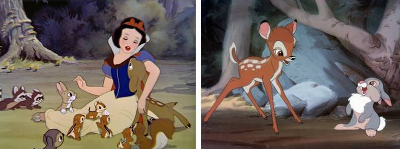 The rounded edges and oversimplified features of the animals in the earlier movie have given way to sharper lines, more detailed expressions, and more realistic movements. Disney’s insistence upon realism pays off in a big way, and it is obvious that the methods used in creating Bambi greatly influenced future animated depictions of animal characters.