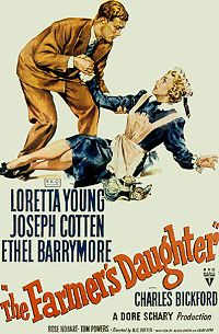 If there is one movie that I really wish TCM would play sometime in the near future, it’s The Farmer’s Daughter, an absolutely delightful comedy starring Loretta Young, Joseph Cotten, and Ethel Barrymore. The movie’s never been released on DVD as far as I can tell (drats!), and I’m seriously jonesing for a fresh viewing.