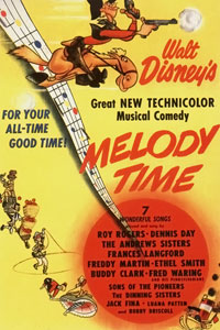 During WWII, many of Disney’s animators were drafted, and eventually the studio itself was commandeered for the war effort, making it difficult to work on big features. Walt had snippets of various things that had been in different stages of production when the war broke out, so he decided to put them to together a la Fantasia to keep things afloat. He did a total of six “package” films. The first two, Saludo Amigos and The Three Cabelleros, Brandie talked about last week; so this week we’re going to talk about the next three: Make Mine Music, Fun and Fancy Free, and Melody Time.