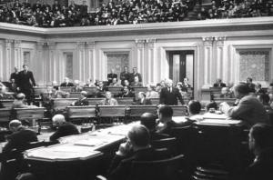 This film also marks one of Jean Arthur’s best roles as the street-smart Capitol Hill insider won over by Jeff’s corn-fed “hokum.” Arthur is sometimes overlooked in the annals of film history–for instance, it remains inexplicable to me how AFI could list the supposed “25 greatest film actresses” and NOT include Arthur–and to modern audiences, she is not among the more well-known film legends. It’s a shame more people aren’t familiar with her work, because Arthur was a truly great actress. More known for her comedic roles, particularly her deft hand at screwball comedy in films such as 1937’s Easy Living and her two previous films for Capra, Mr. Deeds Goes to Town (1936) and You Can’t Take It with You (1938), she was also quite good in more serious roles, particularly her final turn in the seminal 1953 Western Shane.