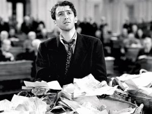 Stewart stars as Jefferson Smith, a young, idealistic leader of the Boy Rangers, who is tapped to replace the recently-deceased junior senator of his state. The head of the state’s political machine, Jim Taylor (Edward Arnold), pressures the state’s senior senator, Joseph Paine (Rains), one of Jeff’s heroes, to keep the young man in line to ensure that Taylor’s political schemes remain in play. Paine tries to distract Jeff with his alluring daughter, Susan (Astrid Allwyn), and convinces Jeff to sponsor a bill in order to keep him busy. Jeff’s secretary, Clarissa Saunders (Arthur), who is initially skeptical about her new boss’s ability to do his job, is eventually won over and assists him in crafting a measure to build a national boys’ camp on some land near Willet Creek in his home state. However, unbeknownst to Jeff, Taylor has his eye on the same property, and has buried the graft in a Public Works bill being supported by the crooked Paine. When the Taylor machine goes to work destroying Jeff’s credibility, he takes over the Senate floor via filibuster in an effort to convince his fellow senators–and his constituents–that there are corrupt forces at play within the government.