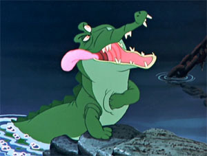 The best element of the entire film is the villain–by turns effeminate, whiny, murderous, and hilarious,  Captain Hook is one of the most engaging Disney bad guys. Though he is comical, he is still dangerously determined and murderous in his pursuit of Peter and his friends. His attempts to get revenge on Peter for the loss of his hand are always foiled by the accursed ticking of the crocodile (who ticks because he swallowed an alarm clock). This sound thereafter warns Hook when his scaly nemesis is near–and send him into a blind panic that is highly amusing. The combination of humor and danger makes the character more than the mere caricature that some of the other characters appear to be–if he were slightly more slyly sarcastic, and slightly less of an annoying git, he’d practically be Maleficent’s (Sleeping Beauty) blood brother.