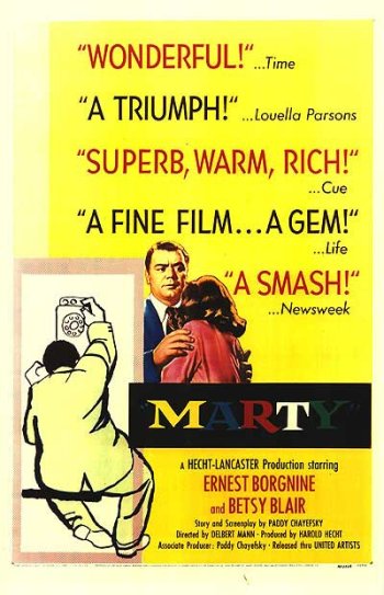 Ernest Borgnine is phenomenal as the title character, a plain, lonely butcher who finds love with an equally plain woman (Betsy Blair), only to face the derision of his overbearing mother and unfeeling friends for his choice of mate. Winner of four Academy Awards including Best Picture, Best Director (Delbert Mann), Best Screenplay (for Paddy Chayefsky), and Best Actor for Borgnine’s performance.