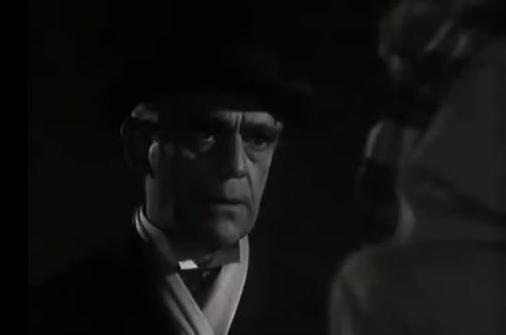 Sandra sets out to answer the personal ads in the newspaper. After a couple of misfires, Sandra finds a promising suspect in the once-famed, now-delusional dressmaker Charles van Druten (Boris Karloff), who became paranoid after finding his designs had been stolen by a competitor. But van Druten turns out to be merely insane–not a killer (and not, judging by the get-up in the picture below, a very competent designer).
