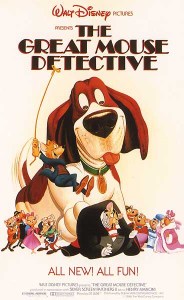 This weekend’s Saturday Morning Cartoon is one of my favourite Disney animated films: The Great Mouse Detective (1986). A rodent version of Sherlock Holmes, Basil of Baker Street is after the evil Professor Ratigan, the world’s worst criminal who manages to stay one step ahead. Basil plays homage to Basil Rathbone, the enigmatic portrayer of Holmes: the film’s silhouettes of Sherlock Holmes depict him, and that’s how Basil got his name. The animators obviously had a great time with the Holmes references: Toby the bassett hound, Dr. Dawson as the narrator and assistant (whose Disney-fied portrayal is influenced by Nigel Bruce, who played Watson opposite Rathbone in several films), the damsel in distress coming to his home at the end, not to mention his clothes, chemistry set, deductive reasoning, and that violin.