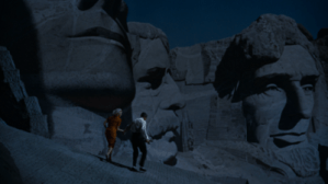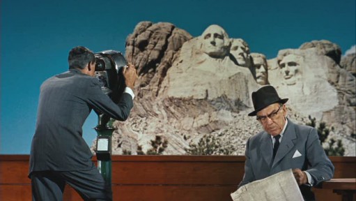 Underlying the action throughout the movie is Bernard Herrmann’s score, beautifully crafted to heighten the tension. Herrmann’s style is perfectly suited to the film, and in fact this was only one of several Hitchcock films scored by Herrmann—he also did the music for Vertigo, Psycho (1960), and Marnie (1964), among others. Herrmann’s work is particularly effective in the final scenes of the film on Mount Rushmore, as Roger and Eve scramble across the monument with Vandamm’s henchmen in hot pursuit and dangle from dizzying heights in their quest to escape. But one of the wisest decisions in regards to the film’s soundtrack involves no music at all. In what is perhaps the movie’s most famous scene, Roger is pinned down in the middle of nowhere by a rogue crop-dusting plane. Rather than trying to build tension by scoring the scene with a crescendo of orchestral maneuvers, as some directors might have been tempted to do in similar circumstances, Hitchcock simply eliminates music altogether and instead relies on the ominous whine of the plane to fill the silence. In the process, the filmmaker creates an almost indescribable sense of dread that rivals even the creepy screech of violins from yet another iconic Hitch moment.
