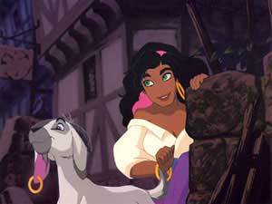 Captain Phoebus, on the other hand, is a bit self-absorbed and clueless, but he has a sense of right and wrong that helps him awaken to the real problems in Paris; in this way, he has some very significant similarities to John Smith in Pocahontas. I always forget that the character is voiced by Kline, though it oddly suits him. It amuses me that Kline, whose Phoebus has many comic interactions with his horse, Achilles, plays such a similar character (Tulio) dealing with horsey hi-jinks in 2000’s animated feature The Road to El Dorado.