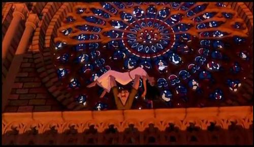 As for the gargoyles, you have to love them. Laverne, a truly great character, is voiced by the wonderful Mary Wickes, who is no stranger to the True Classics crew, having played a part in some of our favorite films (White Christmas, The Man Who Came to Dinner, 101 Dalmatians…). This was actually Wickes’ last film role before she passed away in 1995. As Laverne, she plays a dry-humored character who is definitely the brains of the operation (so, a perfect role, essentially). Interestingly, there actually is a Notre Dame gargoyle that looks like Laverne; we may assume the others depicted in the film are up there, too, but I cannot know for sure. If I had the picture accessible on a computer, I would post it, but I do not. Perhaps someday I will get it scanned and filed.  The other two gargoyles, aptly named “Victor” (Charles Kimbrough) and “Hugo” (Jason Alexander), play foil to one another and provide much-needed comedy relief from the rather dark story line.