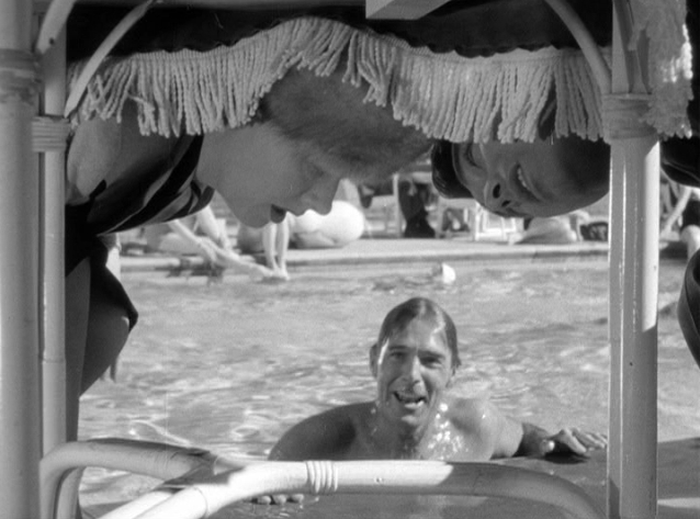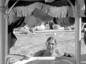 In 1940’s My Favorite Wife, Grant discovers that his long-lost wife, played by Irene Dunne, is still alive after having been shipwrecked on an island for seven years, accompanied only by handsome, well-cut hunk Randolph Scott. Upon first seeing the muscular Scott poolside, Grant’s eyes narrow in speculation; when Scott stands up and reveals his height and muscularity, Grant’s eyes widen and his body suddenly becomes ramrod-straight; when Scott sheds his robe, remaining in nothing more than a tiny pair of swim trunks, his toned physique causes Grant to appear overcome as he pulls out a handkerchief and nervously wipe his face. And as Scott swings on a set of rings, doing a series of back flips before diving gracefully into the water below, Grant watches with a mixture of appraisal and reluctant admiration.