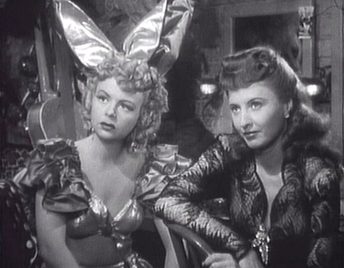 While by no means the best or even the most unique of Stanwyck’s many film roles–after all, she had already played a burlesque star named Sugarpuss O’Shea in Ball of Fire two years earlier–it’s nonetheless an interesting diversion. The movie is a murder mystery set in the backstage world of a popular burlesque theater. Dixie Daisy (Stanwyck) is the headliner at Broadway’s Old Opera House. One night, the theater is unexpectedly raided, and while trying to escape the cops, Dixie is strangled from behind, but survives when the attack is interrupted. Dixie later finds the body of one of her costars, dancer Lolita La Verne, who has been strangled with a G-string. The subsequent murder of a second dancer leads Dixie, her best friend Gee Gee Graham (Iris Adrian), and comic Biff Brannigan (Michael O’Shea), on a hunt for the killer before the show is shut down for good.