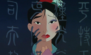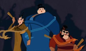 However, I wouldn’t go so far as some critics in calling her a “feminist” role model for young girls. True, through her actions, Mulan shows that girls can do anything boys can do (and, as Annie Get Your Gun told us so many years ago, they can do it better, too), but in order for Mulan to even get the chance to break out of her prescribed gender role, she has to … well, change genders. It’s only through disguising herself as a man that Mulan is able to prove her worthiness, for, as we see in the opening scenes of the film, Mulan is considered a failure as a woman. The song “Honor to Us All” sets up the premise that “a girl can bring her family/great honor in one way/by striking a good match,” but the subsequent episode with the matchmaker shows how ill-suited Mulan is to the overtly feminine “virtues” necessary to land a husband. As she reflects on the disastrous meeting later, through the song appropriately titled “Reflection,” Mulan muses that she “will never pass for a perfect bride/or a perfect daughter,” and wonders, “When will my reflection show/who I am inside?” When she joins the army, Shang promises to “make a man out of you,” and those adopted masculine traits are what eventually define her character and her actions throughout the remainder of the film. Still, it is amusing to note that the tables are turned somewhat in the end, as three of Mulan’s soldier buddies, Yao, Ling, and Chien Po, must dress in drag as concubines in order to infiltrate Shan-Yu’s defenses and save the emperor.