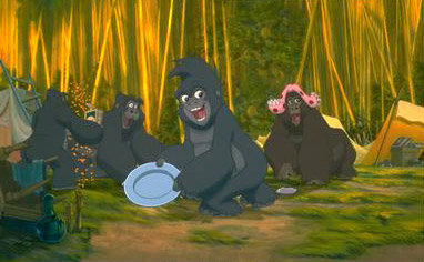 As I mentioned before, Disney’s version is an extremely altered adaptation of Burroughs’ original tales. In much the same way Victor Hugo’s The Hunchback of Notre Dame was severely altered in its journey to the animated big screen, so too was Tarzan virtually sanitized by Disney’s family-friendly police. In Burroughs’ stories, Kerchak (who is an ape, not a gorilla) kills Tarzan’s father (the boy’s mother dies in childbirth) and is Tarzan’s greatest rival among his adopted “family.” Tarzan is eventually challenged by Kerchak and kills him in order to take the ape’s place as the group’s leader. Also, in the first novel, Tarzan’s adoptive mother, Kala, is killed by a member of an African tribe, and he seeks revenge by killing the man responsible for her death. The Clayton in the first Tarzan novel is actually the title character’s cousin, William (Tarzan’s real name being John Clayton, Lord Greystoke), and has inherited Tarzan’s rightful title in his absence. The plot device regarding Clayton’s evil intentions for the gorillas was invented for the film; his main function in the first two books in Burroughs’ series is as a romantic rival for Tarzan. Additionally, the author depicts Jane Porter as initially betrothed to William (before eventually becoming Tarzan’s wife in a subsequent novel), and she is not British but American.