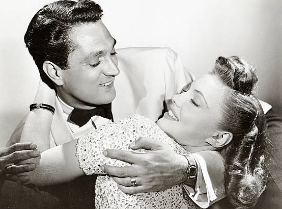 Incidentally, some of our readers may not be aware that the lovely Joan Leslie is still with us at age 86. She began acting when she was still a kid–in her first movie, 1936’s Camille, she was only 11 years old! She’s not as well-known as other actresses from the time period, but Leslie ultimately starred with some of the biggest names in Hollywood: she worked with Alfred Hitchcock in a small role opposite Joel McCrea in Foreign Correspondent (1940); at barely 16, she played one of Humphrey Bogart’s love interests in High Sierra (1941); later that year, she was Gary Cooper’s love in Sergeant York; and she was James Cagney’s adoring wife, Mary, in Yankee Doodle Dandy (1942). She earned her dancing chops with Fred Astaire in 1943’s The Sky’s the Limit. And she had also previously starred with Alda in Rhapsody in Blue. So Leslie definitely made her mark in some really great films. Her career really peaked in the 1940s, though she continued acting in movies and on television periodically throughout the next fifty years.