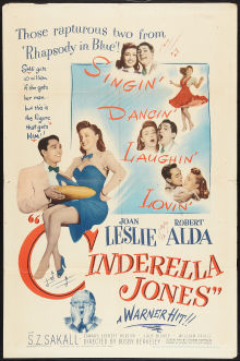 Cinderella Jones is such an odd little movie. There’s really no better word to describe it. It was filmed in the midst of World War II–thus accounting for the patriotic theme and the presence of a convoy of soldiers–but it wasn’t released until 1946 because the studio (Warner Bros.) wanted to distribute the film after Rhapsody in Blue (1945) in order to capitalize on Alda’s growing popularity. This forced the editors to re-cut the movie to remove most of the references to an “on-going” war. The result is a somewhat disjointed picture. And for a musical, the songs aren’t all that memorable or well-staged, which is surprising considering the movie was directed by Busby Berkeley.