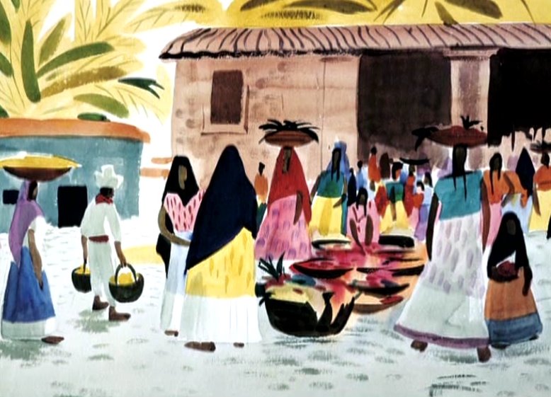 Throughout the 1940s, she worked on the series of Disney package films that were created to save money when the animation studio was essentially forced to shut down production during World War II. Blair traveled to South America with other animators as a part of FDR’s “Good Neighbor” policy, which resulted in the production of the first two package films: Saludos Amigos (1942) and The Three Cabelleros (1944). Both Blairs appear in the flesh (along with Walt and fellow animators Norman Ferguson–the creator of Pluto–and Frank Thomas–one of the legendary “Nine Old Men”)  during the live-action segments that are interspersed between the animation of Amigos.  Blair ultimately served as one of the art supervisors for both of these films, and many of the South American landscapes present in these films are based on watercolors that she painted while on that trip (an example of the concept art she created in South America is posted above).