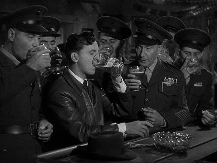 Instead of going home and admitting the truth to his mother (Georgia Caine), Woodrow gets a job in a shipyard. One night at a bar, he orders a round of drinks for a group of six Marines who’ve just returned from Guadalcanal. Their leader, Sgt. Heppelfinger (William Demarest), fought in World War I beside Woodrow’s father, whom he respected greatly. The group of Marines listens to Woodrow’s story, and they come up with a scheme to pass Woodrow off as a returning hero to save face in front of his mother.