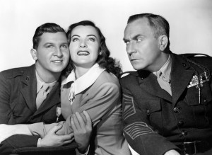 Hero also features supporting turns by Elizabeth Patterson, perhaps best known as Mrs. Trumbull on I Love Lucy, as Libby’s aunt, and Freddie Steele, a former World Middleweight Boxing champion, as one of the Marines. Hero presented Steele with his first acting role, but since the film’s release was delayed, he actually appeared on-screen in several other films first (including a bit part in The Miracle of Morgan’s Creek). In Hero, Steele plays Bugsy, the Marine with “momma issues” and PTSD whose interference starts the chain of events that leads to Woodrow’s deception. Given his pugnacious attitude and take-no-nonsense film persona, his background as a world-class fighter comes as little surprise. Steele’s film career wasn’t long–he made his final film in 1948–but he made a name for himself with a series of military-type roles, including a part in 1945’s Story of G.I. Joe.