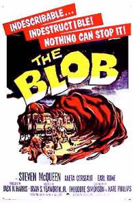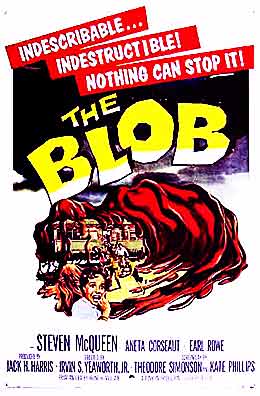 “My first movie experience was when I was four or five years old. My mom has two sisters who are eight and ten years younger than she, so when I was five, they were sixteen and fourteen. One afternoon, they took me and my cousin (my mom’s older sister has a daughter three months older than I) to the movies. Whether the teenaged aunts wanted two five year-olds tagging along to the Saturday afternoon matinee is still a mystery, but off we all went anyway. Everything was amazing, from the smell of the popcorn to the huge movie screen. We happily munched on popcorn and Junior Mints (still one of my favorites today) through all the pre-feature items, with our favorite being the cartoon. Then the movie started. Lo and behold, it was the horror picture The Blob (1958), starring a teenaged Steve McQueen. My cousin and I nearly twisted each other’s hands off waiting for The Blob to roll off the screen and down the aisles toward us! I guess nobody asked, ‘What’s playing? before we left Grandma’s house that day!”