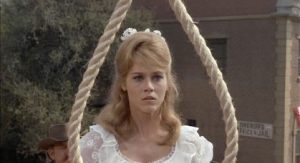 As famed as she was as an actress, however, Fonda’s political and social activism drew much more attention during the heyday of her career. Her anti-war activities during the Vietnam War made her an infamous figure, particularly in the wake of the “Hanoi Jane” incident in which Fonda was photographed sitting on an anti-aircraft gun, an action that was seen as a slap in the face to American soldiers who had been targeted by such machinery during the conflict. In the aftermath of that photograph’s publication, still shots from the hanging scene in Cat Ballou were doctored and used to encourage anti-Fonda sentiment amid calls for charges of treason against the actress. [On another side note: my high-school U.S. history teacher LOATHED Jane Fonda with a passion. I will never forget the day she stood at her podium in front of our class and launched a thirty-minute diatribe about how much of a traitor Fonda was to this country. It was, to say the least, a surreal moment, and one that always comes to mind every time I see a Fonda film!]