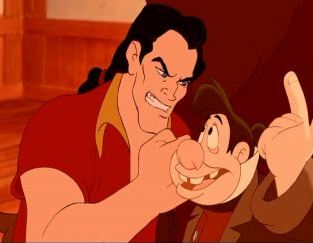 LeFou is Gaston’s right-hand man, and as such, he has many roles in the film: ego stroker, punching bag, errand boy … LeFou is short and fat as opposed to Gaston’s virile manliness (which LeFou lauds in one of the funniest songs in the Disney songbook. I dare you not to laugh when Gaston brags that he is “especially good at EXPECTORATING!” After all, the ability to spit is the ultimate sign of a man’s man). LeFou is abused and serves as the butt of the jokes–and takes on the brunt of Gaston’s anger. He never takes initiative to step outside of that role, seeming content to be a lackey and soak up whatever leftover adoration he can get from Gaston’s many admirers. Essentially, what the characterization of LeFou tells us is that the less masculine you are, the more of a bumbling imbecile you may be. And you will certainly never get the girl—in fact, the girls will laugh at you while fawning over your ripped (and equally idiotic) friend.