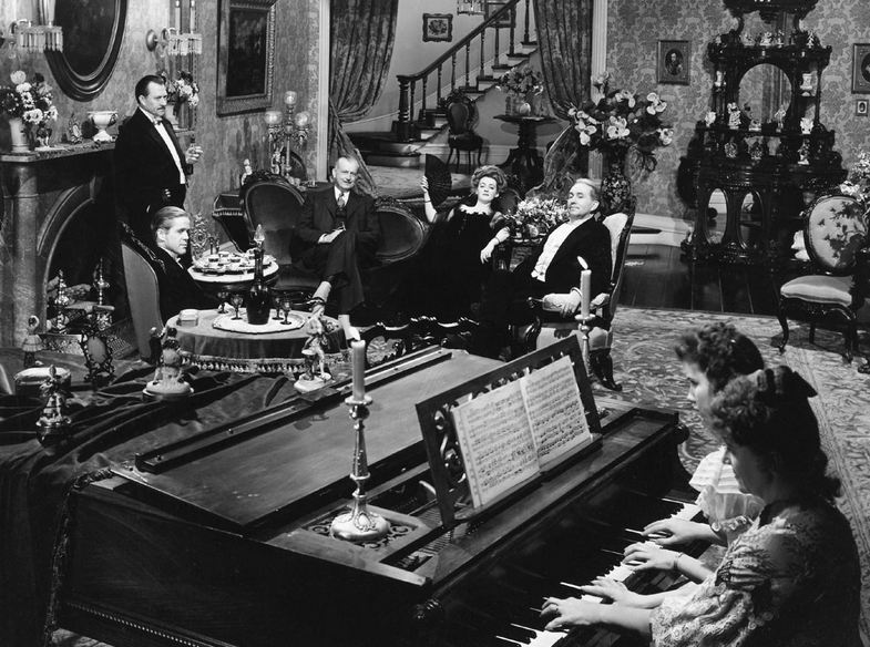 Early in the 1941 film The Little Foxes, there is a brief, exquisitely-crafted scene that tells us everything we need to know about these characters. The Hubbard family, having just finished dinner with a wealthy guest and potential business partner, has gathered in the parlor for a musical performance. But this is no pleasant interlude; the entire scene is fraught with tension, with multiple characters precariously balanced on tenterhooks–albeit for different reasons. Alexandra, or “Zan” (Teresa Wright), the young daughter of Regina Hubbard Giddens (Bette Davis), sits at the piano with her Aunt Birdie (Patricia Collinge). Alexandra, miserable at being put on display, is overly nervous and misses the final notes of the tune. For her part, Birdie, already tipsy from the wine that accompanied dinner, just wants to get through the piece so she can have another drink. Regina sits on the sofa with William Marshall (Russell Hicks), the Chicago industrialist whom the family is trying to convince to partner with them in starting up a cotton mill. She reclines back with seeming ease, languidly waving a black fan in front of her face as if she hadn’t a care in the world. But Regina’s ease is superficial–her eyes dart around the room constantly, telegraphing her disapproval at any perceived misstep that might ruin the deal. Regina’s brother, Oscar (Carl Benton Reid), having just snapped at his wife, Birdie, for her liquid overindulgence at dinner, leans against the mantel, stern and unrelenting. His son, Leo (Dan Duryea), is in his own little world, and can barely hide his boredom. And Regina’s other brother, Ben (Charles Dingle), reluctant to pause his “hard sell” of Marshall for a little chamber music, fidgets and tries to start up the conversation once more in the middle of the song … only to close his mouth when Regina reaches out and kicks him in the shin. And thus, in the course of a mere three minutes of brilliant staging, director William Wyler manages to reveal the personality and motivations of every person sitting in that room, with barely a word spoken between them.