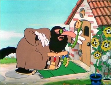 Popular as it was (and still is), Pigs is not without its controversy, which has led to latter-day censorship of one particularly insensitive sequence. Walt Disney’s notoriously ingrained antisemitism (yes, the man was antisemitic, whether you want to believe it or not–there are multiple instances of his having made horrible comments about the “Jew studios” in Hollywood over the years) was reflected in a scene in the original cartoon in which the Wolf disguises himself as a stereotypical Jewish peddler, complete with a long beard, bulbous nose, and exaggerated Yiddish accent. The film has undergone several edits over the years to alter this: initially, it was reanimated to portray the Wolf as a Fuller Brush salesman (though the original vocals nonsensically remained), and later the soundtrack was re-dubbed to remove the accent altogether.