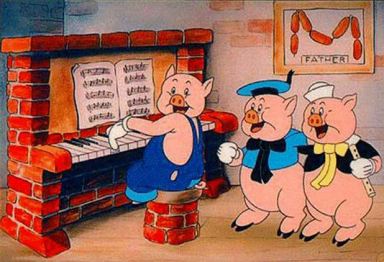 Three Little Pigs is a relatively simple fable about the importance of hard work in keeping the “big bad wolf” away from your door. Fifer Pig and Fiddler Pig would rather build their houses hastily so they can continue to play their instruments (the flute and the fiddle, respectively) all day long. But the Big Bad Wolf has other plans–he blows down Fifer’s straw house, and does the same to Fiddler’s house of sticks. The two seek refuge in the solid brick home of their brother, Practical Pig, whom they had earlier made fun of for spending his day building the house, and the Wolf, unable to blow down the sturdy structure, is ultimately stymied in his attempt to have pork chops for dinner.
