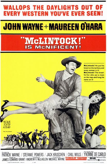 McLintock! (1963) is my favorite John Wayne movie. Not being a big fan of Westerns in general, this hardly may be great praise, but perhaps it is. It is on my short list of “westerns worth watching.” I love the humor, the banter, and the playfulness of this movie.