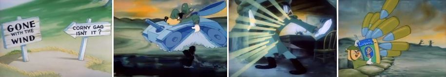 Admittedly, Blitz Wolf loses some of its bite for those unfamiliar with the parodic subject matter; for modern-day viewers, the humor of gags such as the title card touting the cartoon’s conservation of precious rubber (which was the first item to be subjected to rationing upon the start of the war) is generally lost. [This situation is common with World War II-era toons, as I discovered a couple of years ago.] But this cartoon is far from a mere relic of wartime propaganda. In context, it’s a brilliant satire of a terrible human being and a terrible conflict; out of context, it’s still a damn funny cartoon, thanks to some pretty wonderful gags from a true master of the craft.
