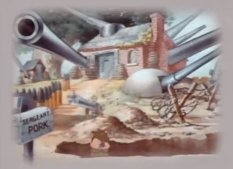 Adding to the audacious nature of the short, Avery does something quite witty and unexpected in one early scene, when Pork’s less-intelligent brothers (who believe their non-aggression pact signed by that “colossal stinker Adolf Wolf” will protect them) taunt their more worldly sibling as he digs a barrier around his already-fortified home. “You’re in the Army now/You’re not behind a plow,” they sing. As Pork continues digging, they continue, “You’re digging a ditch!” before the action pauses–total freeze-frame–for a full beat until they conclude the verse, “You’re in the Army now!” It’s a highly clever way for Avery to incorporate the popular “dirty” version of a familiar Army chant while eliminating the sticky fourth line (“You son of a bitch!”) to appease censors.